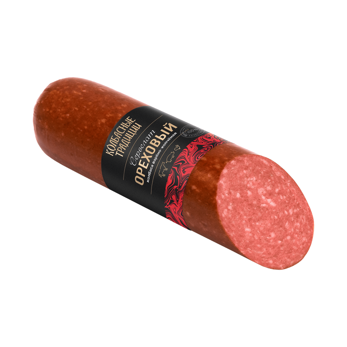 Варёно-копчёная колбаса «Сервелат Ореховый» приготовлена по традиционному рецепту из отборной говядины, свинины и куриного мяса. Нежный шпик и натуральные специи придают насыщенный вкус с лёгкими ореховыми нотками, а копчение наполняет продукт аппетитным ароматом. Выдержка в фиброузной оболочке и бережная обработка сохраняют сочность и выраженный вкус.